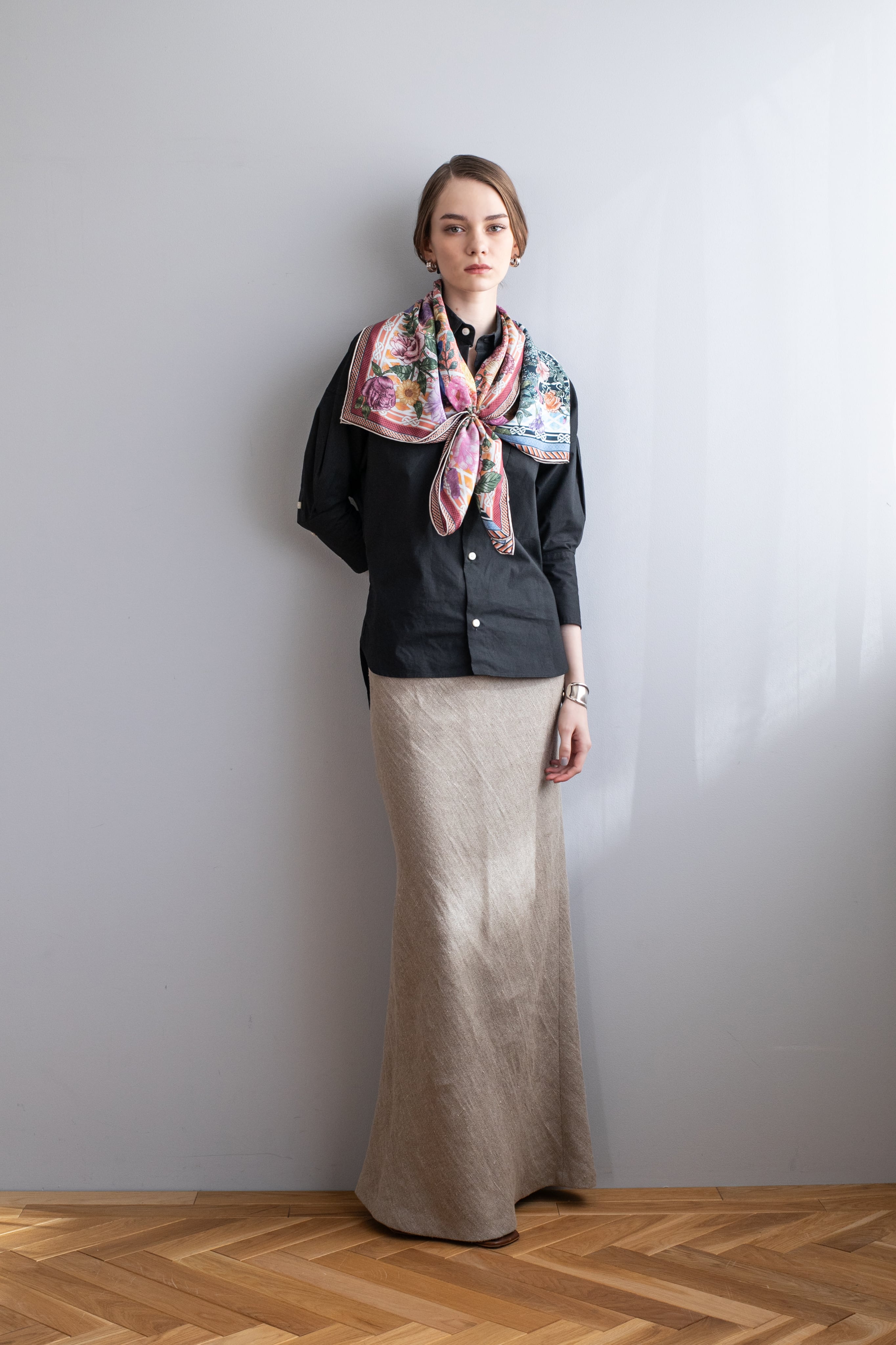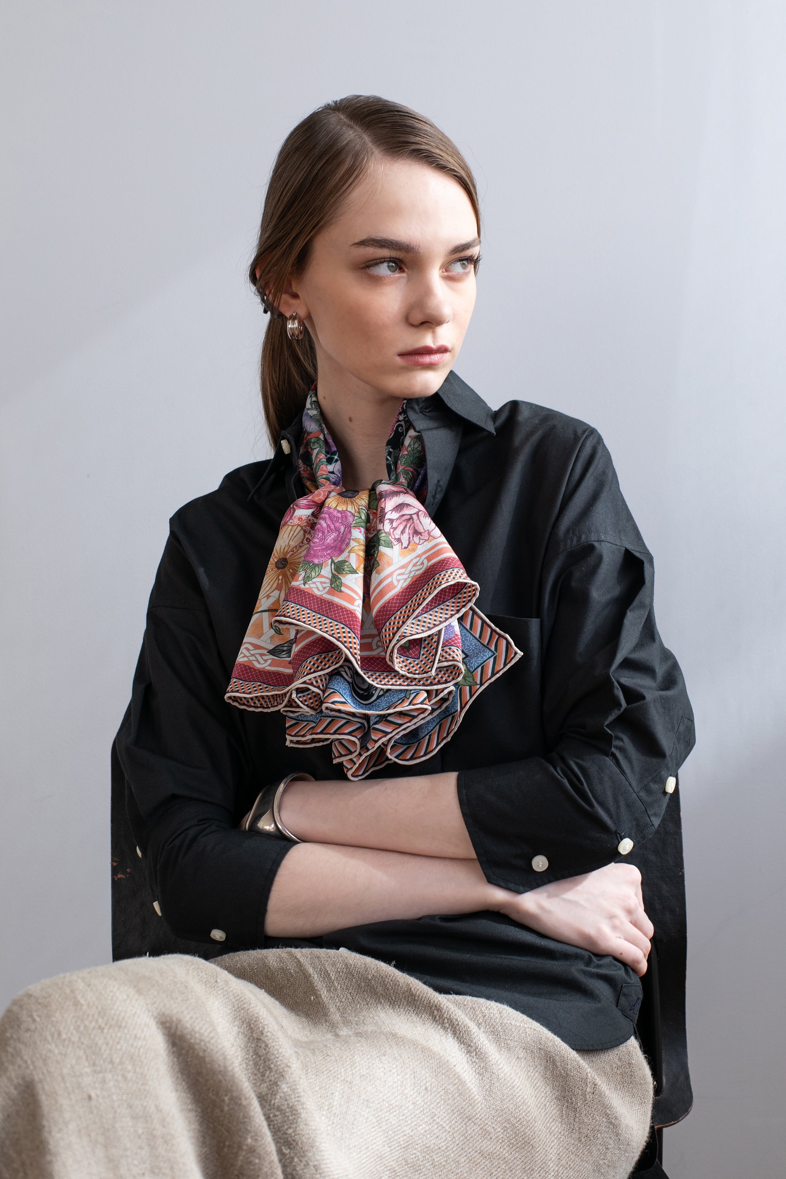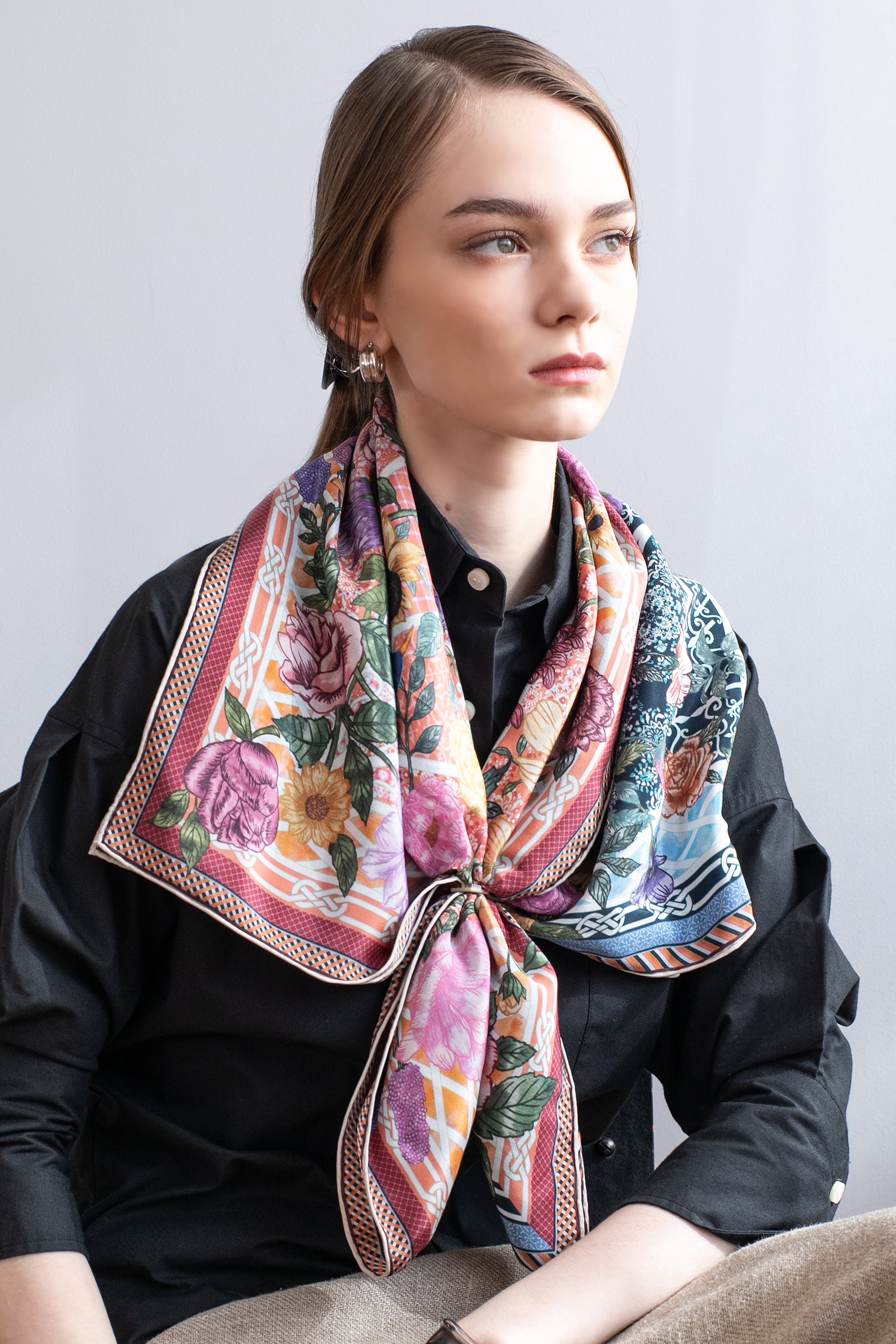 巻き方によって、エレガントにもカジュアルにも見せる事ができるのが、シルクスカーフの良い点です。大きくドレープを作り巻いたり、コンパクトに結んだり、様々なファッションと合わせる事ができます。