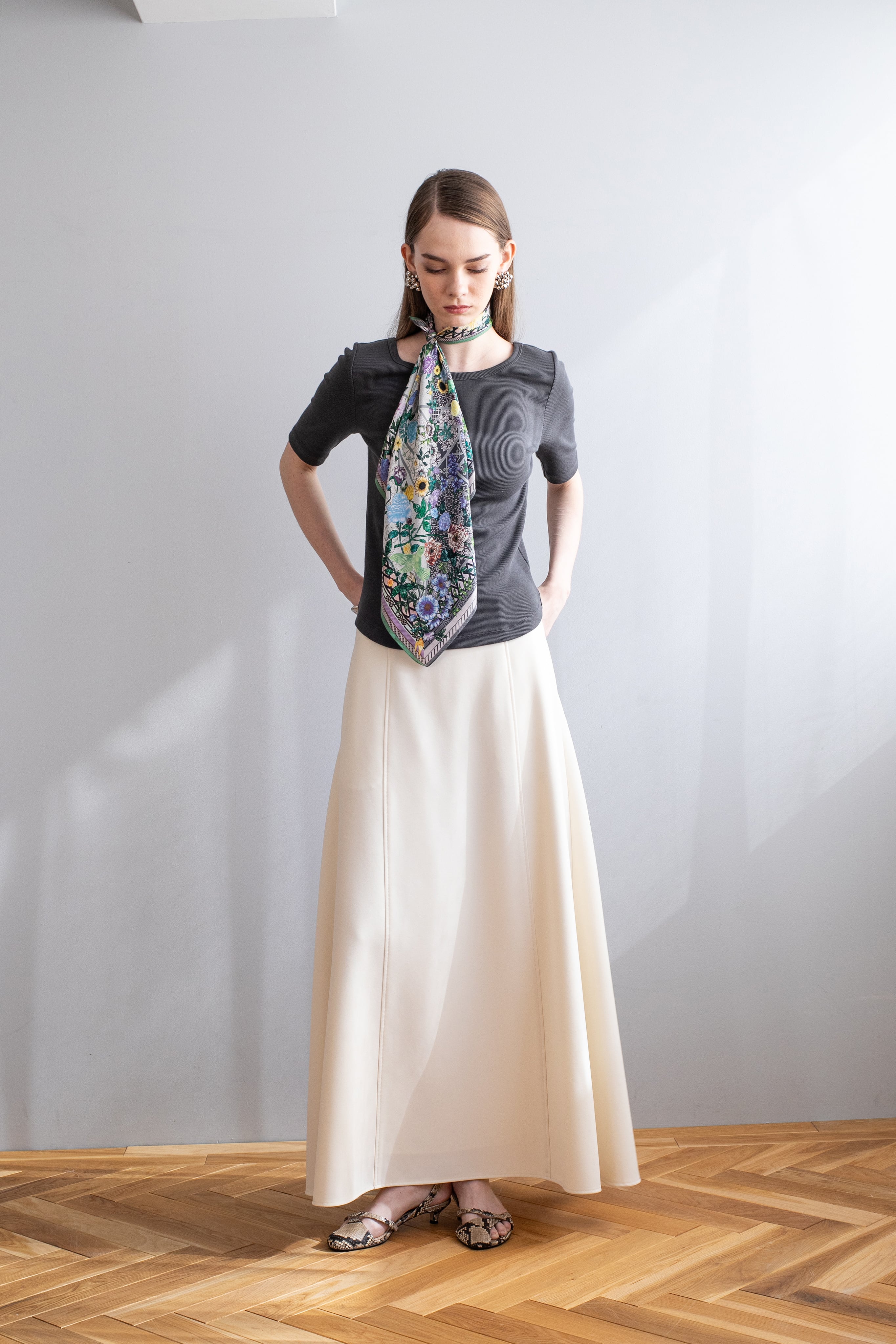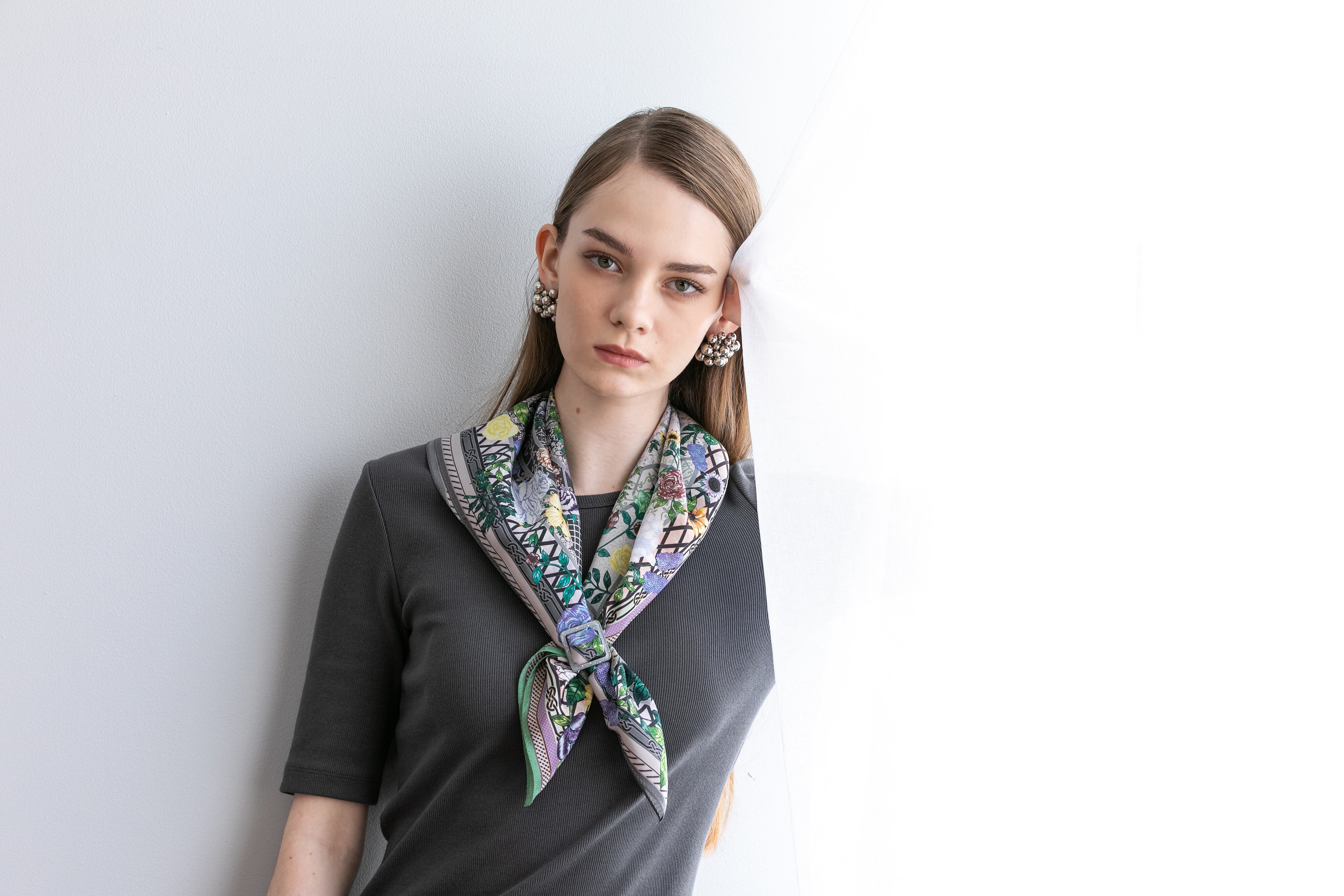 巻き方によって、エレガントにもカジュアルにも見せる事ができるのが、シルクスカーフの良い点です。大きくドレープを作り巻いたり、コンパクトに結んだり、様々なファッションと合わせる事ができます。