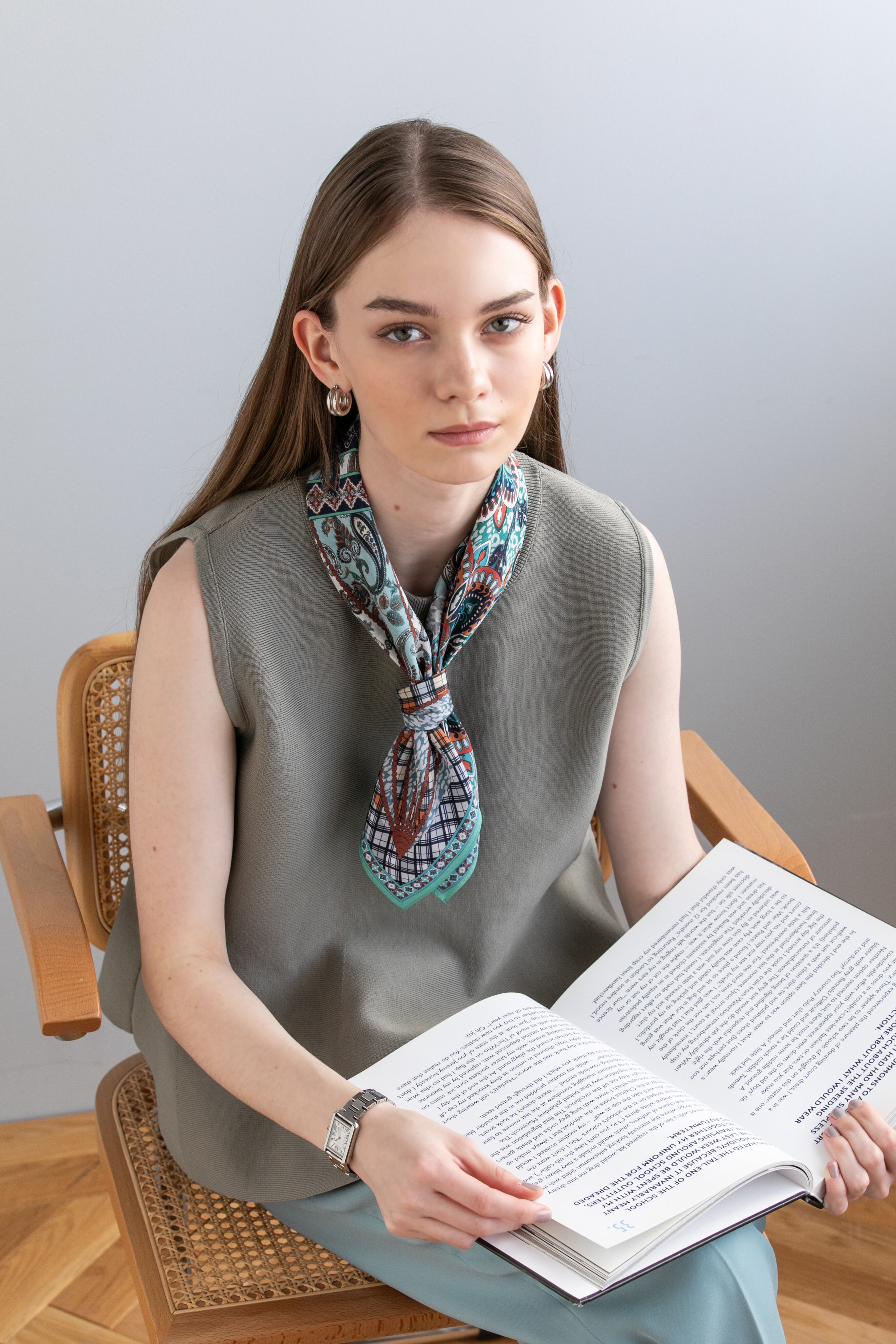 スカーフのどの部分の色柄を見せて巻くかによっても、印象が変わり、1枚のスカーフで何通りものコーディネートが楽しめます。