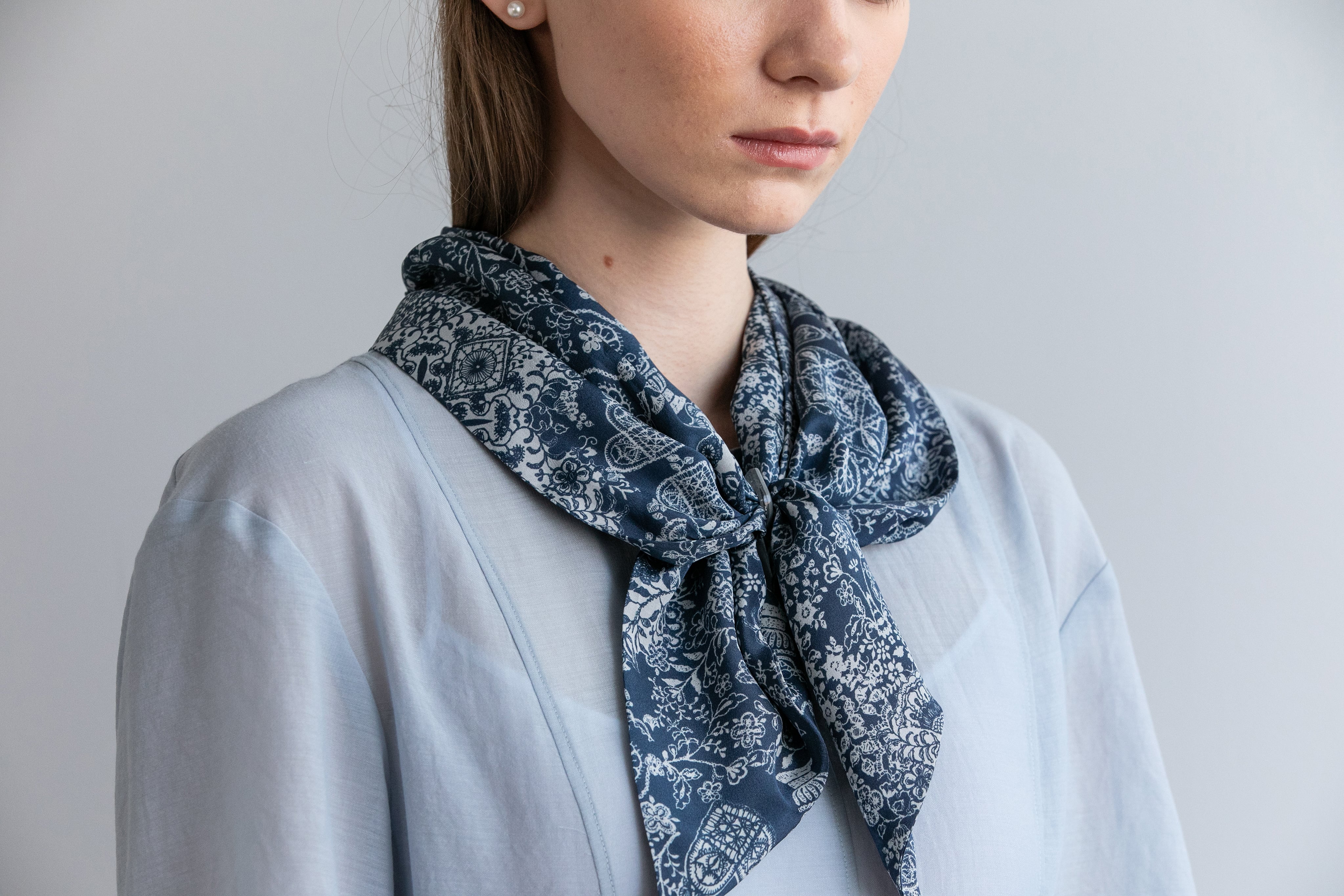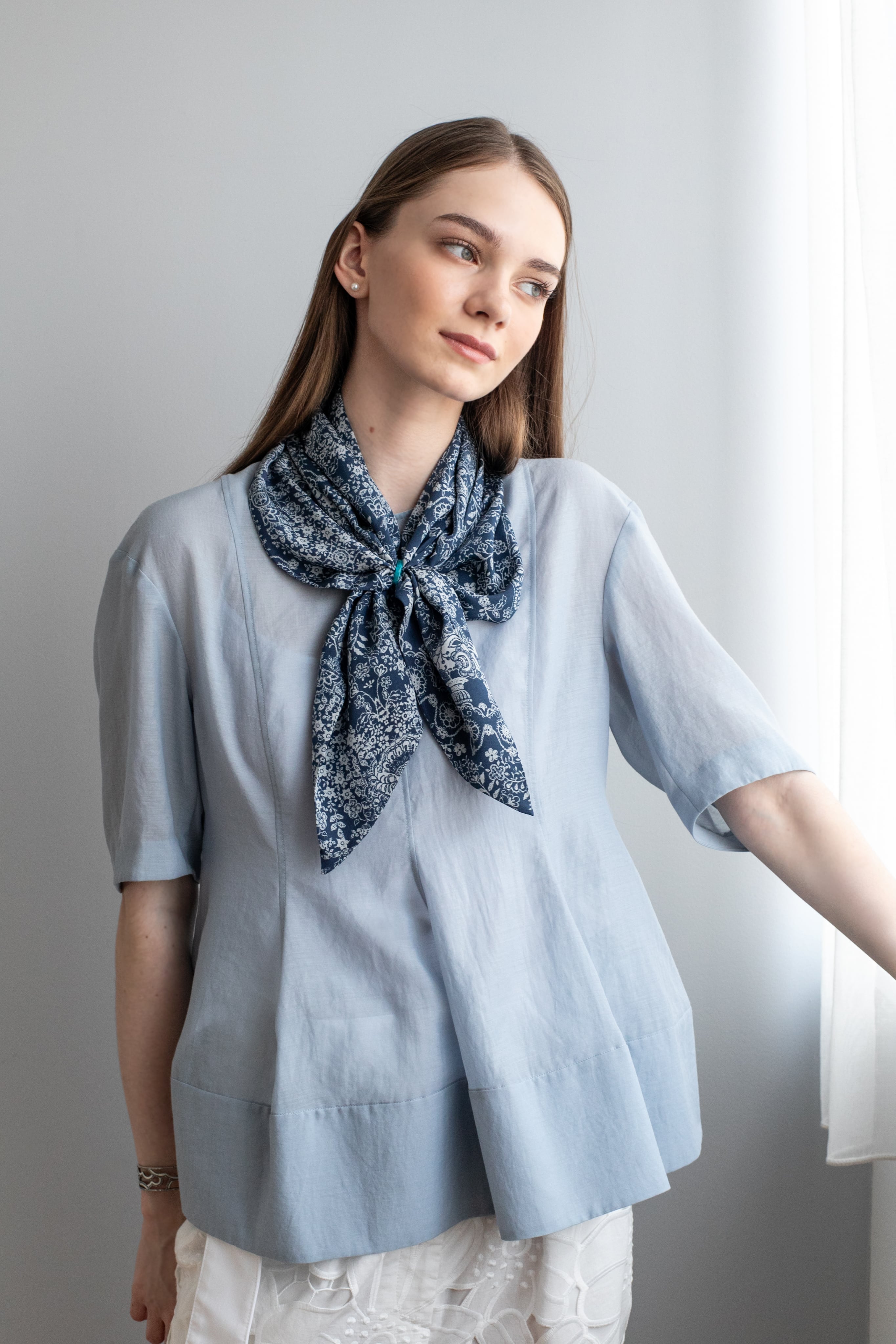 巻き方によって、エレガントにもカジュアルにも見せる事ができるのが、シルクスカーフの良い点です。大きくドレープを作り巻いたり、コンパクトに結んだり、様々なファッションと合わせる事ができます。